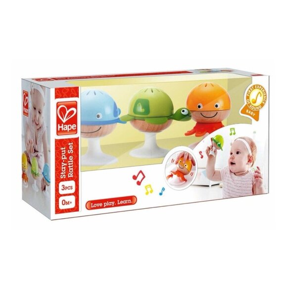 The Hape Put-Stay Rattle Set will enchant your little one with its differing sounds, bright colors and aquatic animals. Moreover, with their handy suction cups, playtime is possible anywhere, anytime! Thoughtfully developed infant toys stimulate baby senses and encourage discovery. Improve Early Grasping Skills Enable your little one to explore their geometric rattle a little, let them improve their gross motor skills and stimulate the sense of hearing as they shake their rattles.
