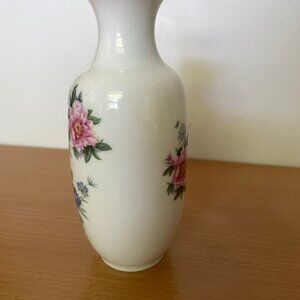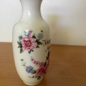 Happy Anniversary 7" bud vase hand decorated Canada white porcelain pink rose