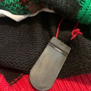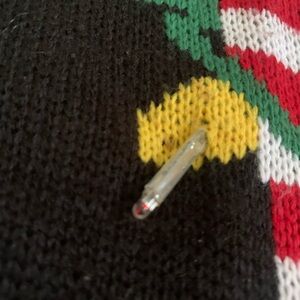 Get into the festive spirit with this fun and quirky light-up "ugly" Christmas sweater! Perfect for holiday parties, family gatherings, or just spreading some cheer. The sweater features a whimsical elf design on a black background, complete with green and white striped sleeves, and red cuffs and waistband. The elf's outfit is decorated with what appears to be a string of Christmas lights that actually light up! A small, discreet battery pack with an "on/off" switch is tucked inside the sweater to power the lights.