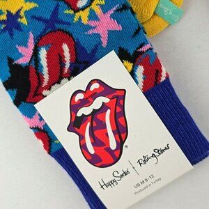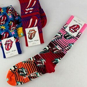 New with tags, Happy Socks x Rolling Stones men's 3 pairs crew socks in a multi colored Rolling Stones signature mouth & tongue all over logo pattern and made with a soft combed cotton blend with comfy stretch, size 8-12.