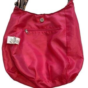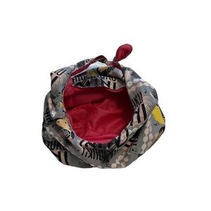Nice quality fabric with an adorable hot pink interior with a zippered pocket. Would be great as a purse as well.
