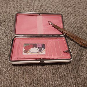 Medium tan coloured wallet case with pink interior, card slots and change purse and enough room for your medium smaller phone all inside the case.