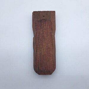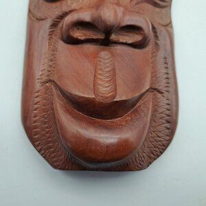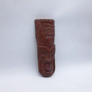 A small tribal wall mask made of a reddish hardwood. It is winking 1 eye, has a star and a leaf pattern as its headdress. It is heavy for its size at a little over 2 pounds.