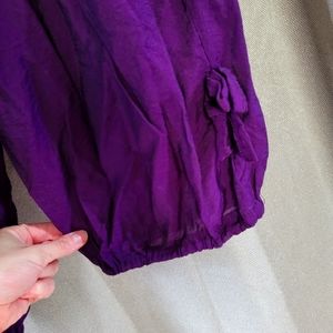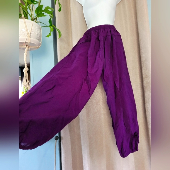 Silky and flowing. Great for high-rise look. Fits S/M. Lovely Purple with zippered pockets. Tie ankles.