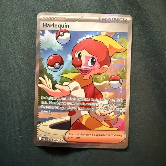 Enhance your game with the vibrant Harlequin Trainer Card. Featuring a playful design in red, yellow, and orange, this card is a must-have for enthusiasts.