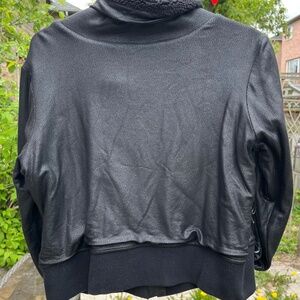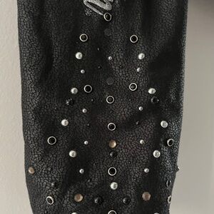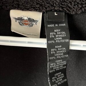 Harley Davidson black distressed leather look jacket. Fabric looks like aged/crackled leather. Embroidered company name in script silver sparkly thread down right arm. Both wrists smattered with a variety of gems, two front pockets, zipper on/off, fuzzy at the neck, and turnover style collar.