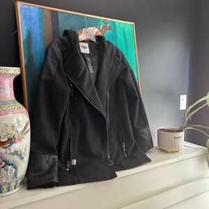 Sleek black leather jacket with zipper details. Perfect for a bold look.