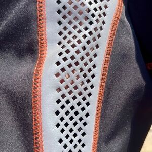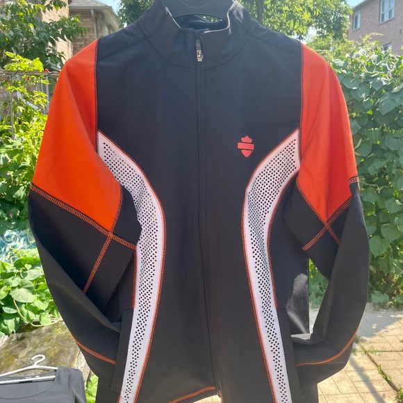 Harley Davidson mens lightweight zip jacket. Black, orange, & reflective silver. Beautifully vented @ back & front, collared neck, bar & shield on left chest, rubber HD patch on back.