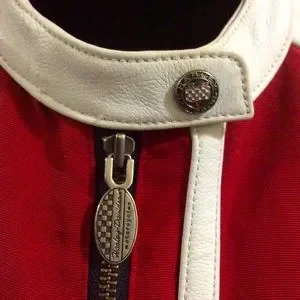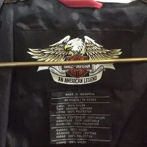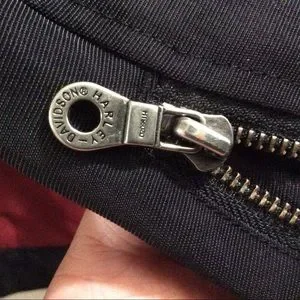 Embroidered HD on bottom front and Harley Davidson on the back. Also embroidered black and white checkered flag style down right arm.