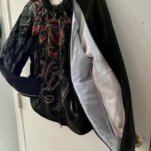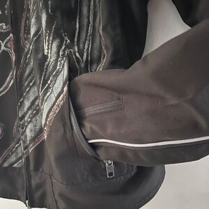 Harley Davidson black, pink, white, and gray textile riding jacket. This beautiful riding jacket has a few features I’ve never soon on another. Take for examble the zip arms that run along the length - to open up to allow for maximum ventilation.