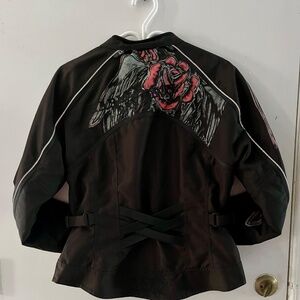 Mesh inner lining also has a pocket for armour. Zipper tabs are hard plastic with the signature Bar & Shield. Company name and year are embroidered in black thread on the back. The front design is a rose & wings with HD lettering. Rose & wings on the back also.