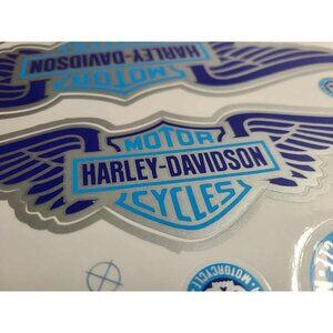 The product is a Harley Davidson vinyl sticker decal featuring blue and silver wings. Manufactured in Thailand, this 2023 release is designed to withstand various weather conditions, making it a durable and long-lasting collectible for motorcycle enthusiasts. Perfect for adding a touch of style and protection to your vehicle, this sticker is a must-have for fans of the iconic Harley Davidson brand.