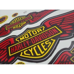 The product is a Harley Davidson vinyl sticker decal featuring red and yellows wings. Manufactured in Thailand, this 2023 release is designed to withstand various weather conditions, making it a durable and long-lasting collectible for motorcycle enthusiasts. Perfect for adding a touch of style and protection to your vehicle, this sticker is a must-have for fans of the iconic Harley Davidson brand.