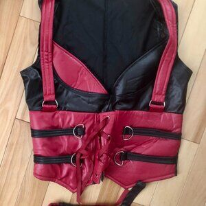 Includes: Black & red faux-leather style vest with lace-up front and matching pants with diamond patterns. The pants have loop, but the costume does not come with any belt.