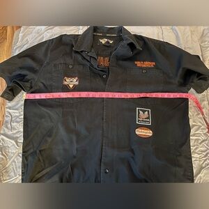 Classic black button-down with Harley-Davidson patches. Ideal for casual wear.