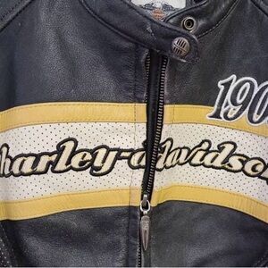 Stylish Harley-Davidson women's jacket in black and white with yellow accents. Perfect for a bold and fashionable look.