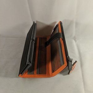 Black exterior with orange interior. Attached keychain.