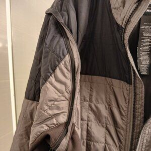Sleeves zip off to convert to vest. Bungee cord and toggle hem. One horizontal interior pocket