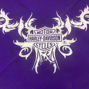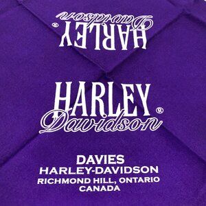 A biker staple that reps the brand you love! Lightweight bandana features a classically cool paisley design with the iconic Harley-Davidson logo for a tried-and-true Harley look. Cut from a breathable cotton polyester blend, it's ideal for wiping away the dirt and grit of the open road or can be worn as an accent piece. Measurements: 21” x 19.5”. Material: 50% Cotton, 50% Polyester. Colour: Purple. Officially licensed by Davies Harley-Davidson, Richmond Hill, Ontario, Canada. LIKE NEW vintage condition with minor folds from storage.