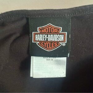 Vintage-style Harley-Davidson 3/4 sleeve top in black featuring the iconic orange and white front logo with “Harley-Davidson Motorcycles” text.