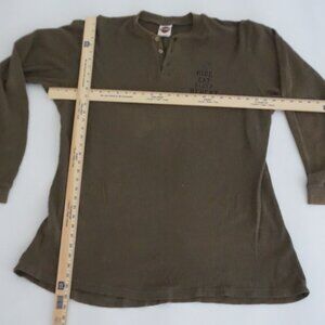 The soft 100% cotton thermal fabric gives it that cozy, textured warmth without feeling heavy, making it ideal for layering under flannels, denim jackets, or leather. The henley button placket adds a classic touch, while the iconic spell-out graphic elevates it into something that reads Retro, Eclectic Grandpa, and quietly rugged all at once. Pair it with dark denim, worn boots, or cargos for a strong everyday fit that never tries too hard but always looks intentional. There is a minor flaw where a finger is pointing in the photo, but it doesn’t distract from the overall look or wearability of the piece.