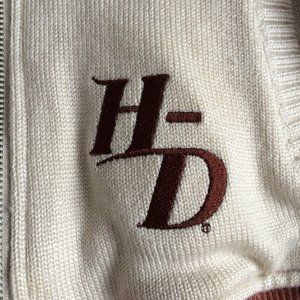 Embroidered HD on left hem and strip label on right pocket on the knit side