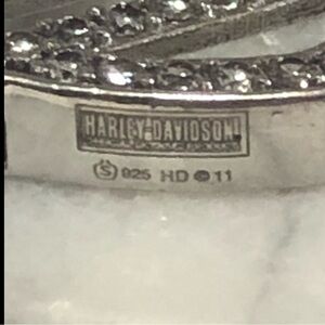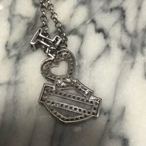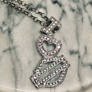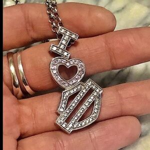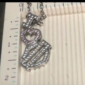 Sterling silver pink and white crystal “I Heart Harley Davidson” Bar and Shield pendant.