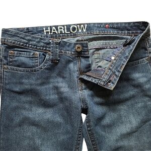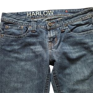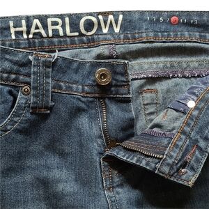Harlow blue denim, jean capris,cutoffs. Two front pockets with watch pocket, two back pockets with purple design on the back, zip up with button closure. Super comfortable lightweight, fold up bottom. Size 9