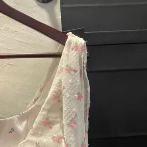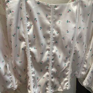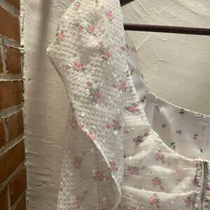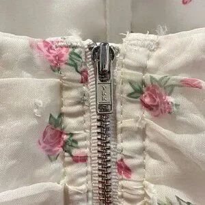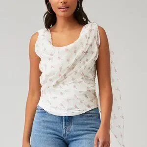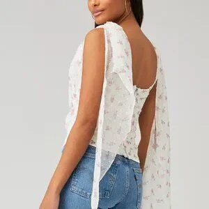 Draped For Love & Lemons top in a lightweight, fluttering floral chiffon. Features an asymmetrical off-the-shoulder neckline that can also be worn on both shoulders. Corset boning down the bodice and layered drape detailing. Finished with cascading ruffles at the shoulders.