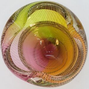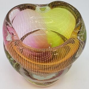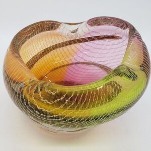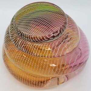 Approx. size: 6"(w) x5"(l) x 4.5"(h). EUC with no signs of wear or use; no chips, cracks or scratches. This stunning glass bowl is in excellent condition given its age & the colours blend together seamlessly to form a delightful rainbow sherbert glow. Embedded glass fibres placed within the glass give it a wonderful abstract look & lattice finish. High quality glass as evidenced by it's amazingly smooth clear bottom.