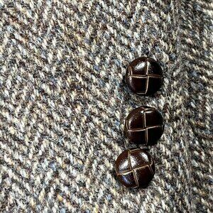 Design: Two-button front; notched lapels; flap waist pockets; three-button cuffs with brown leather woven/knot buttons