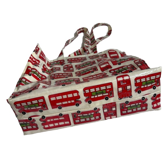 Harrods London Buses Tote PVC Shopping Bag Shopper Waterproof Red Cream Green