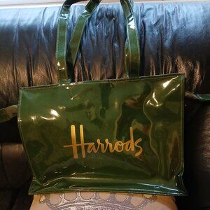 "Instantly recognisable and elegant in style, this green patent shopper from the Signature collection boasts a glossy exterior and gold-tone Harrods logo lettering to finish. A must-have souvenir from the Knightsbridge store to remember your time spent in London."