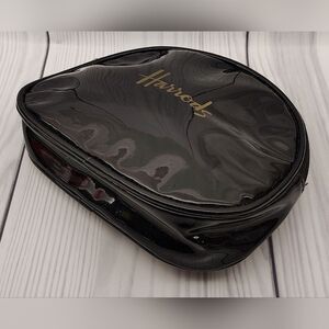 Sleek black Harrods makeup bag featuring a shiny finish. Adorned with a gold Harrods logo.