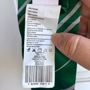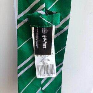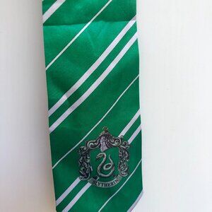 Authentic Harry Potter Slytherin tie, official Wizarding World merchandise by Rubie’s. Classic green and silver striped design with the Slytherin crest. Perfect for cosplay, Halloween costumes, Harry Potter theme parties, or collectors. Unisex teen & adult size 14 yrs +. Made of polyester satin with printed crest. Originally sold at Universal Studios and retail stores. Preowned but in very good condition.