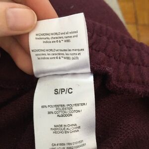Harry Potter jogging pants. Gryffindor logo on pant leg. HP snitch on thigh. Maroon colour. Flared at bottom. 65% polyester 35% cotton