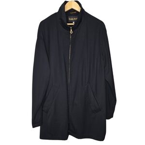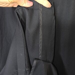 Long sleeve black jacket. Features a full zip closure and two front pockets. Gold zipper detail.