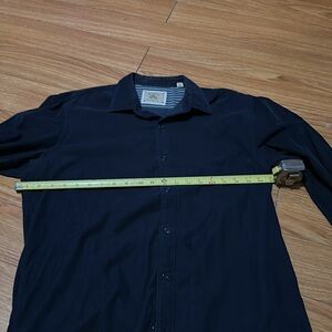 Dark blue. Harry Rosen shirt. It’s like a fine, super soft corduroy. 100% cotton. The material tag is barely legible. Has nice striped material inside cuffs. Size medium. Made in Romania.