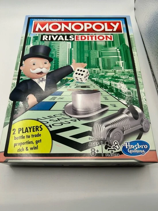 Hasbro Monopoly Rivals Edition board game. Features a green-themed game board and components for 2 players. Enjoy fast-paced property trading with classic Monopoly pieces. Great for competitive play and family game nights.