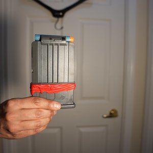 Inspired by the one used in Fortnite, the motorized, clip-fed SMG-E dart blaster captures the look of the one in the popular video game, from its color scheme to the spikes, iron sight, and more details.