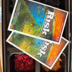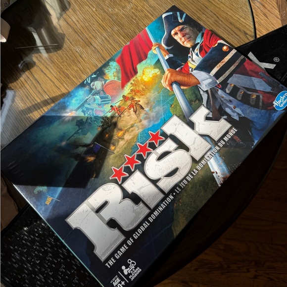 Strategic world conquest board game by Hasbro. Bold artwork features soldiers and flags. Large embossed title on the cover. Includes patriotic blue, red, and white graphics.