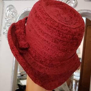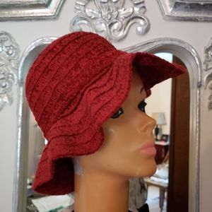 Adjustable brim hat. This hat is made with flexable wire around the brim so you can shape it as you please. I tried to get the right color in the photos but I just can't achieve the exact color. It is close to a red wine color. Since it's a knit it would be a M to L size.