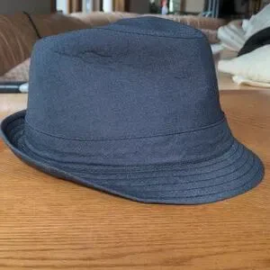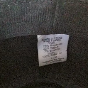 In great condition, 76% polyester, 22% rayon and 3% spandex.