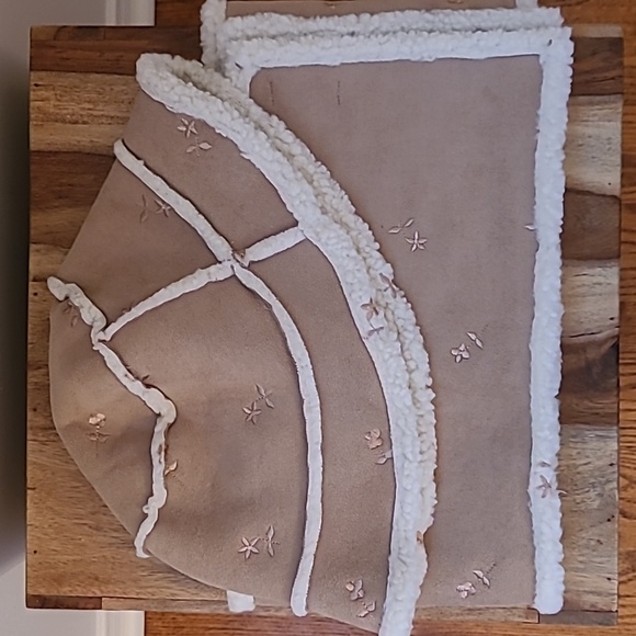 Camel and beige hat & scarf set. Acrylic Polyester feels and looks like a suede and sherpa underside. Soft and Warm. Cute details of stitched star flowers. Measurments in pics.