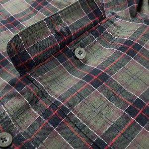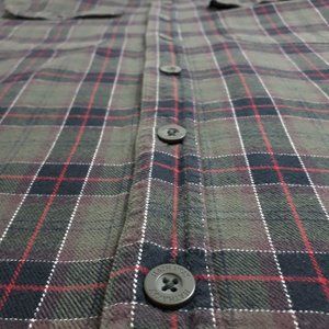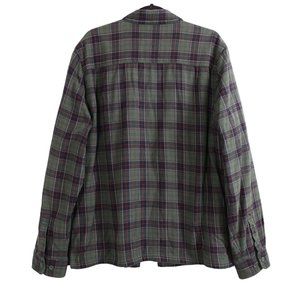 A warm jacket in a green plaid pattern for outdoor recreation and adventures. Made with soft cotton on the outside and a cozy sherpa lining on the inside. The button-down design includes a split collar, two front chest pockets, side split hems and two buttons on the sleeve cuffs. Perfect for spring and fall. Great condition.