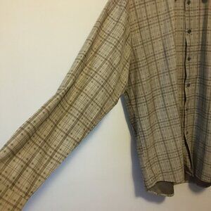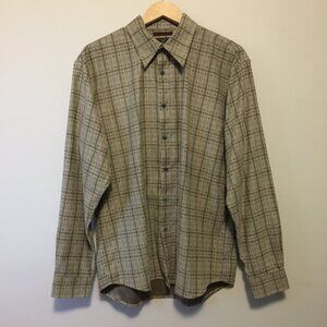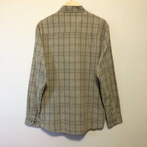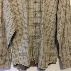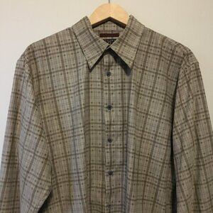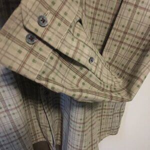 Very good preowned condition, greyish tan button down, faux suede dress shirt by Hathaway featuring a plaid pattern in greyish green/olive and burgundy. Love this colour palette. Nice earthtones and timeless quality. This is definitely a mens shirt, but I think it could be cool as a unisex shirt as well.