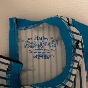 Stylish swim rashguard by Hatley. Features blue sleeves and black striped pattern. Perfect for sun protection.
