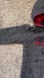 Soft dark gray footie with cozy hood. Features red and white accents. Ideal for comfort and style.