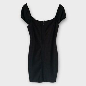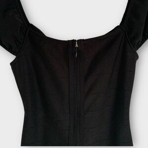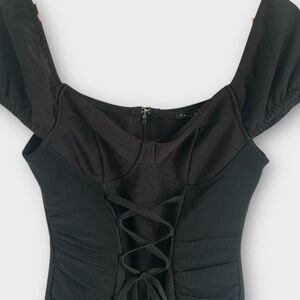 Chic and sultry black bodycon dress with short puff sleeves and a flattering ruched silhouette. Features corset bustier top, lace-up front detailing with metal-tipped ties and hidden back zipper. Stretchy double-layered fabric for a curve-hugging fit. Wear on or off the shoulder.