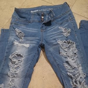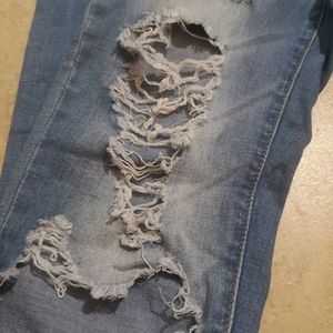 Great Condition! Distressed blue stretchy jeans... I guess they are like a jeggings material more but look just like Denim. Make your booty look👌 very stretchy, pockets in the front are fake but has real back pockets.